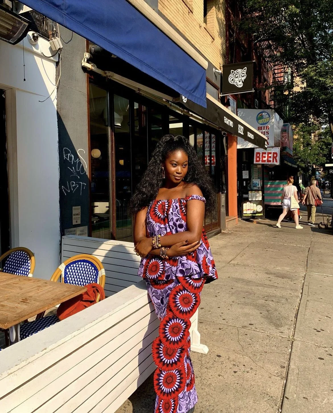 One recurring theme that we can expect to see in Fofana’s clothing brand is bold prints & colors. In this photo, Fofana is photographed on the intersection of Allen Street & Stanton Street in the Lower East Side of Manhattan, where she was born and raised. She designed and produced six matching sets with this exact same silhouette. She sourced the exact amount of fabric that she would need to create each dress. The scraps that were left over from each dress were turned into each set’s matching headwraps.
