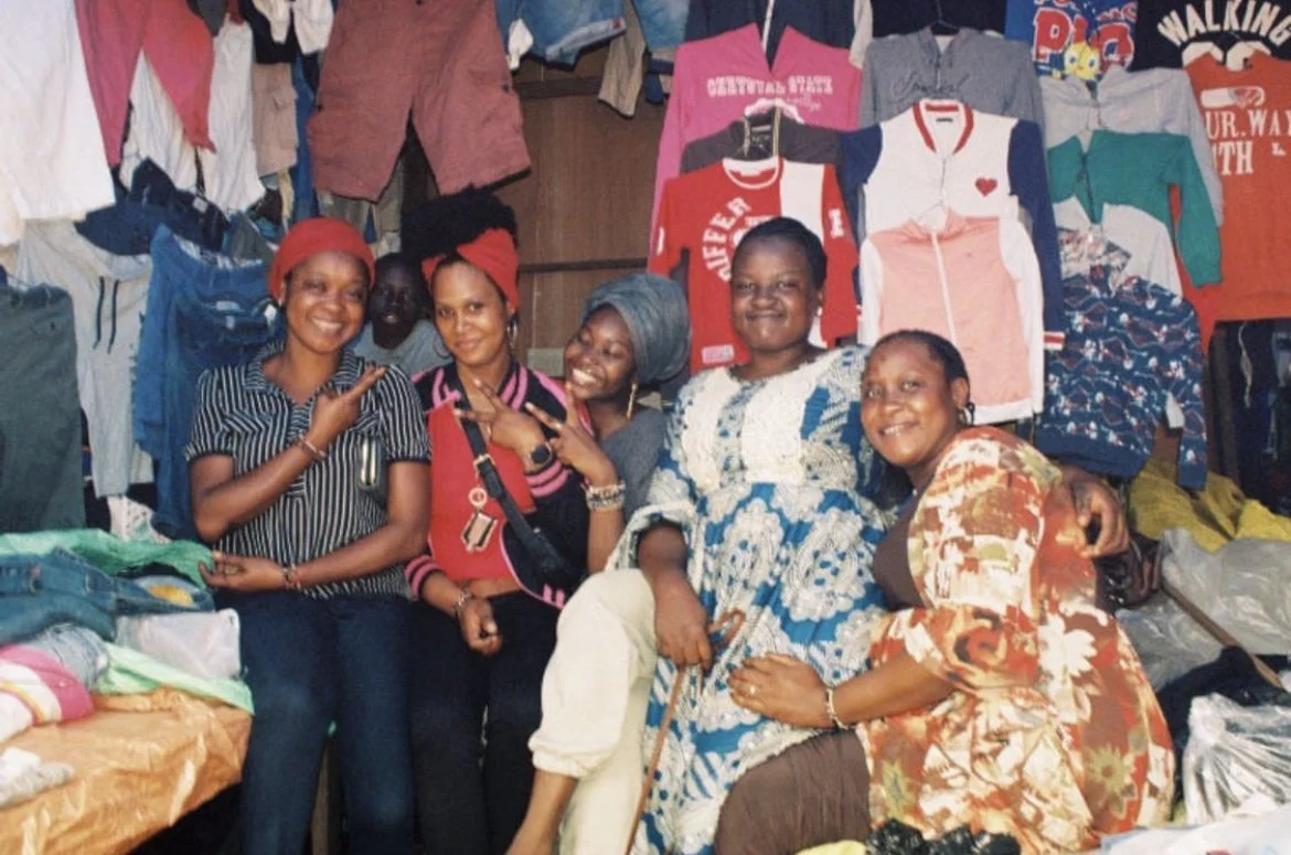 In this photo, Fofana is sitting in between her cousins and her extended family members. They are spending the day in Tata’s thrift shop in Madina. Tata is the mother of Fofana’s cousin, and she has been selling 2nd hand clothing in the Madina market for over two decades. Fofana and her family in NYC sent barrels of their lightly worn clothes to Guinea every year for as long as she can remember. Sustainability is at the core of Fofana’s brand— from environmental consciousness, to human & economic advancement.